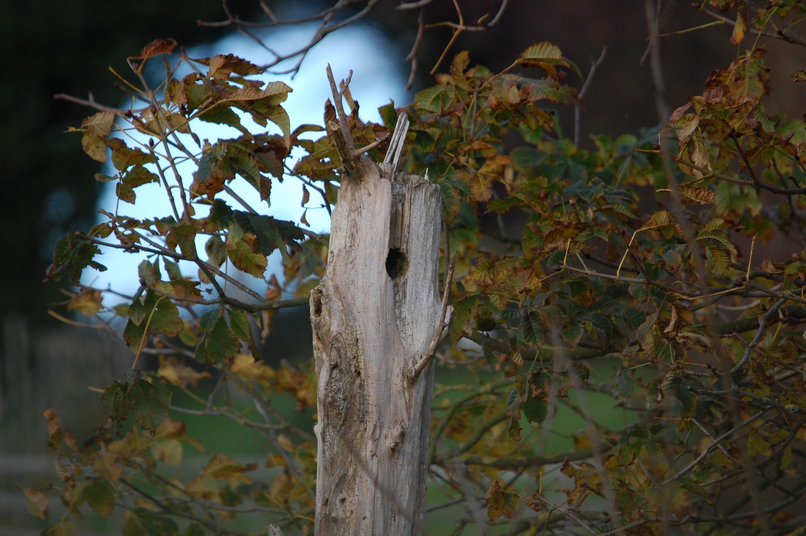 Woodpecker hole in tree, you can tell it's a woodpecker hole because you can see where they've drummed the hole - means it's not just a hole where a branch used to be. |