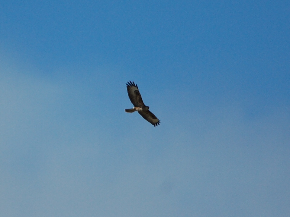 | Buzzard at Kilcoole - the geese/ waders know that the Buzzard is no threat to them, so they never lift because a Buzzard's in the air. |