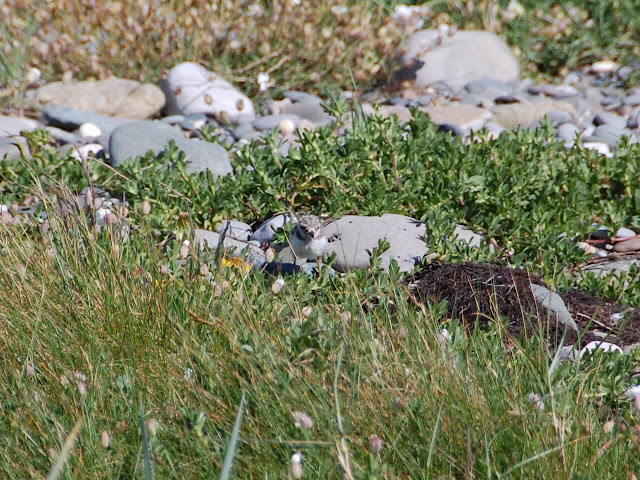 | Not easy to see, but one of the Ringed Plover chicks was trundling around in front of the hide. |