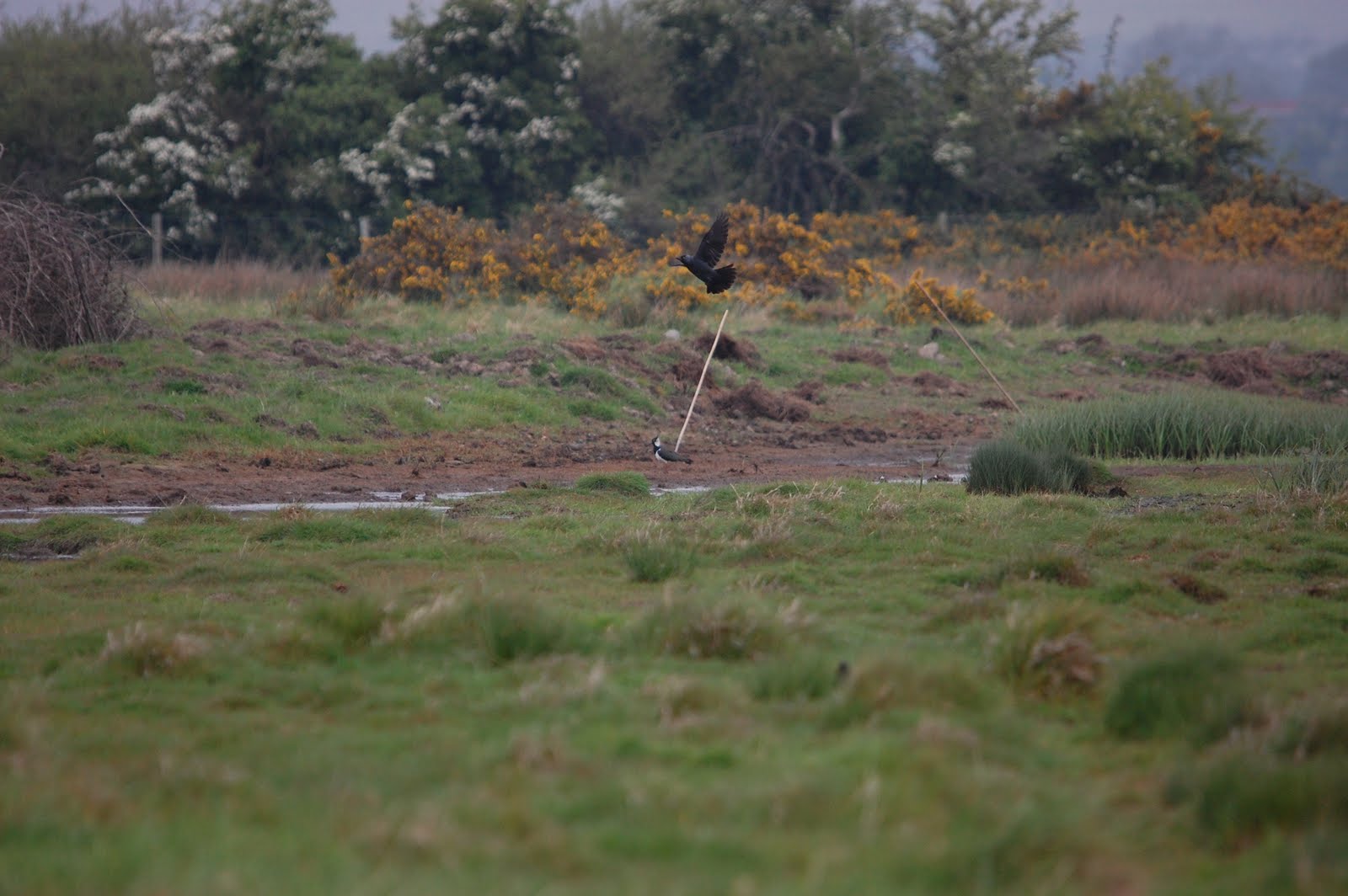 2 Lapwings with 3 little lapwing chicks, fighting off constant mobbing Jackdaws. Rogerstown, North Dublin. |