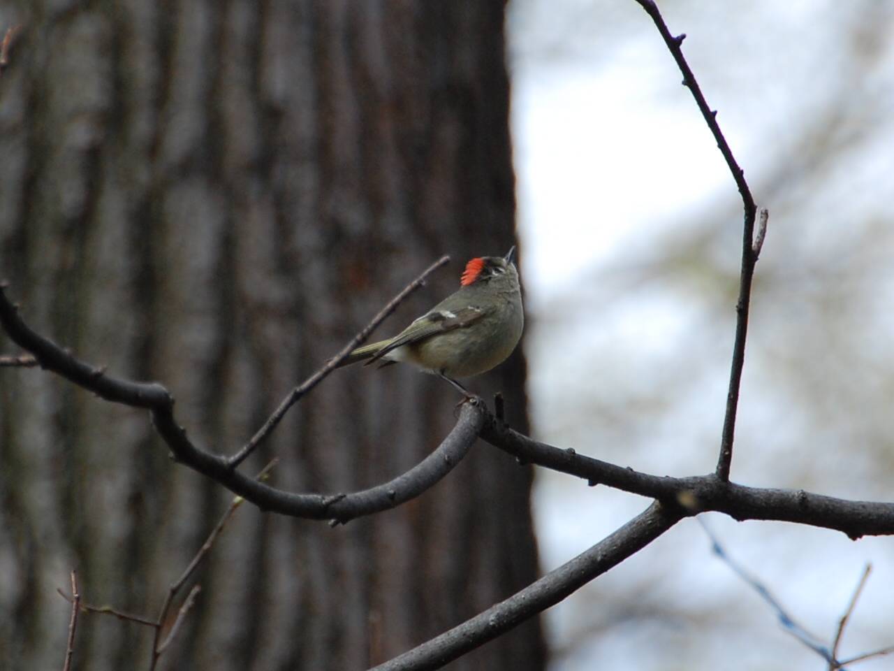 This was a 'Kinglet', the crest showed it's red feathers when it was alert/stressed. I see it's called a Ruby crowned kinglet but I think the birders that day all called it a Red Crested Kinglet