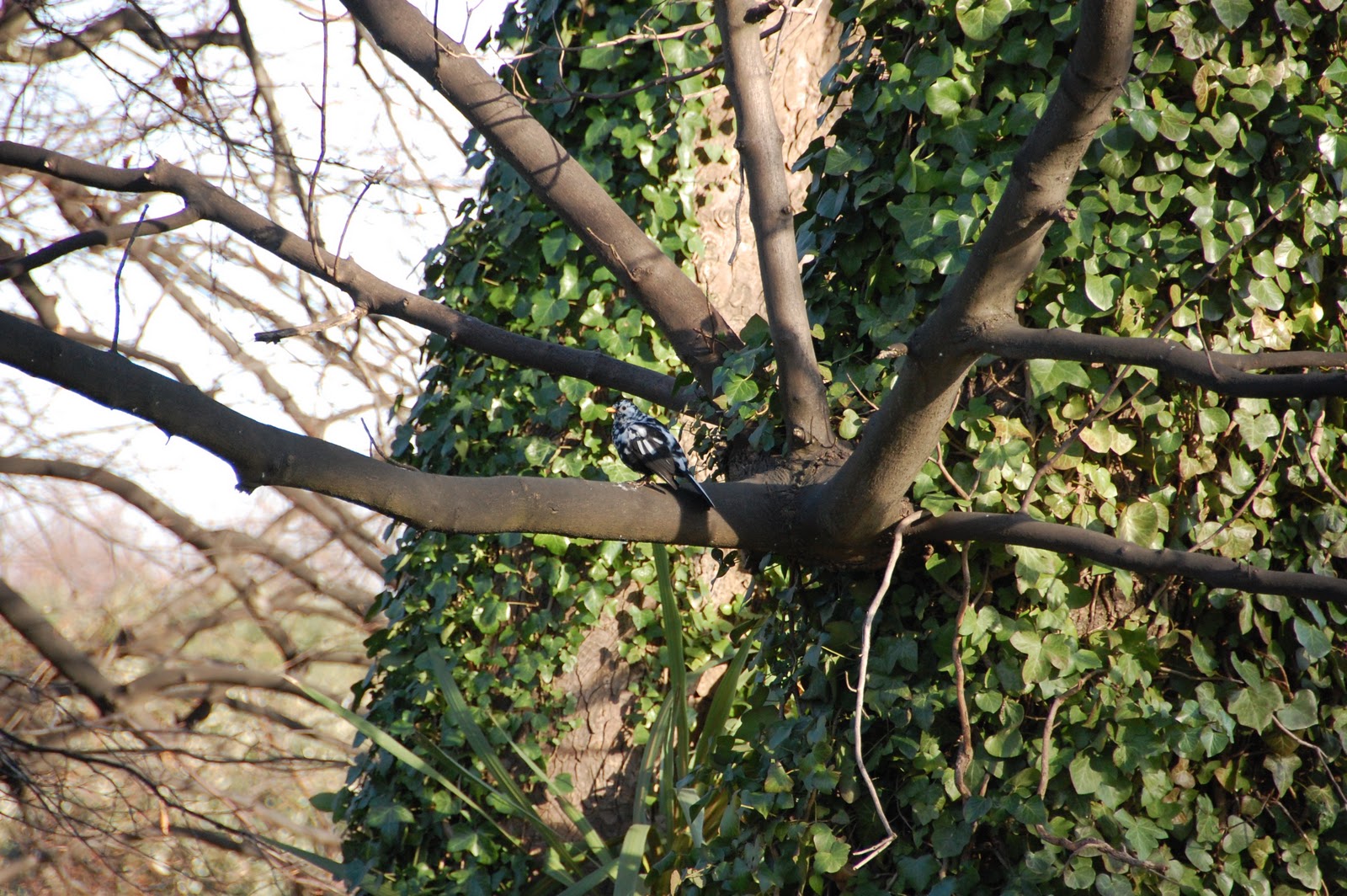 I saw Blackbirds, Wood pigeons, Goldcrests, finches and tits coming and going - and then I saw it, a black bird flying onto a tree showing off a lovely white tipped tail. Could it be?! I got the 'heart jump' and stayed very still. Took out my binocs and sure enough, black head, white tail feathers and white spots - along with - a yellow beak and obvious yellow eye ring. I was looking at our old friend, the ucd leucistic Blackbird.