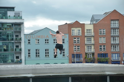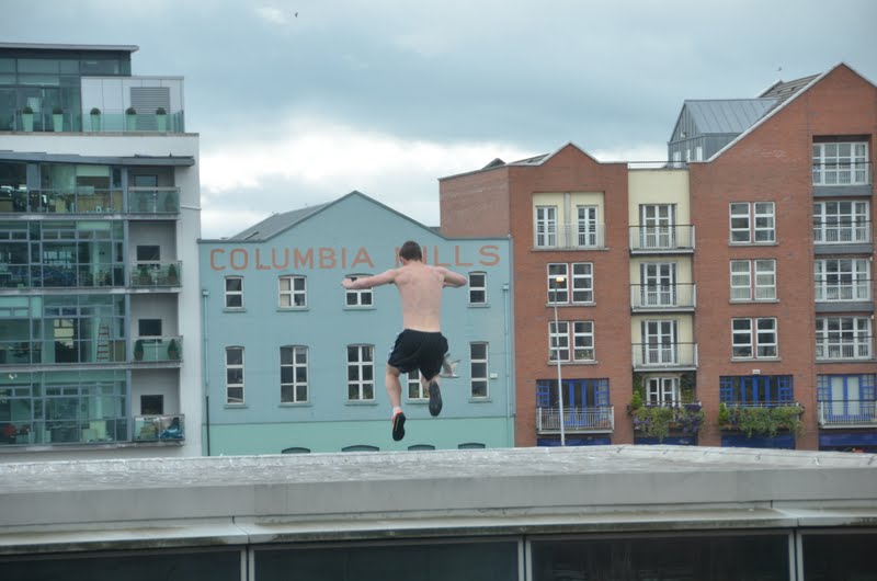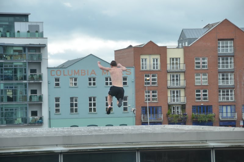 | The guy on the right, in the wetsuit, just ran and jumped into the River Liffey |